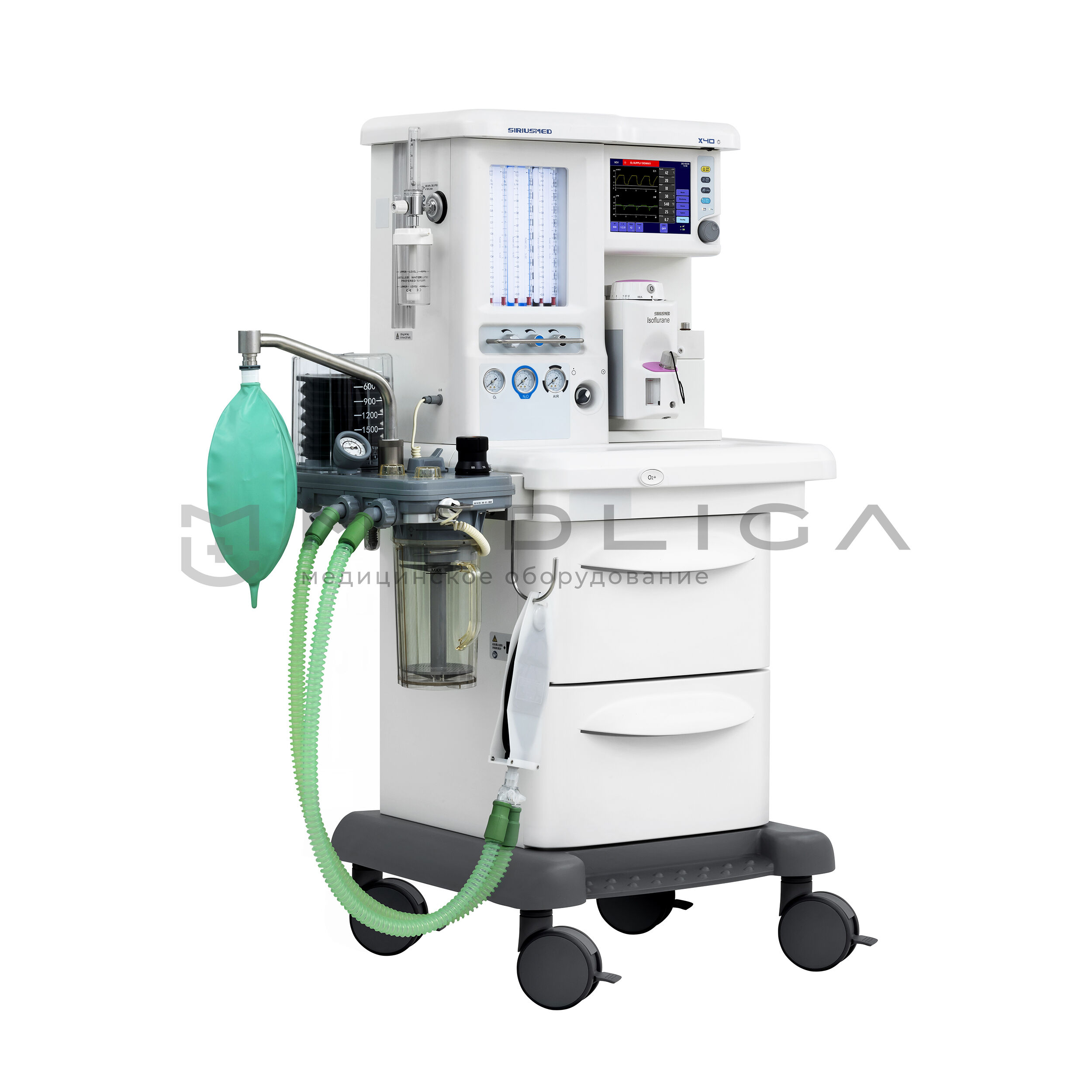 Тележка. Базовая комплектация уже имеет расширенную комплектацию для работы анестезиолога. Трехгазовая версия (О2, AIR, N2O). База на два испарителя Selectatec Interlock. Рельсы с обеих сторон для крепления монитора пациента и ПК. Крепление для двух резервных баллонов О2 и N2O. Три встроенные медицинские розетки 220В для дополнительного оборудования. Светодиодная подсветка рабочего столика и механических ротаметров. Центральный тормоз фиксирует все 4 колеса одной педалью. Подставка для ног врача. Встроенная батарея на 90 минут. Два вместительных выдвижных ящика. Встроенные порты VGA и USB.