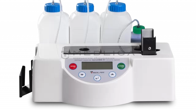 Автомат окраски мазков крови АвтоОМК-01 применяется в медицине и ветеринарии. Трудоемкий процесс ручной окраски мазков крови становится удобным и высокопроизводительным