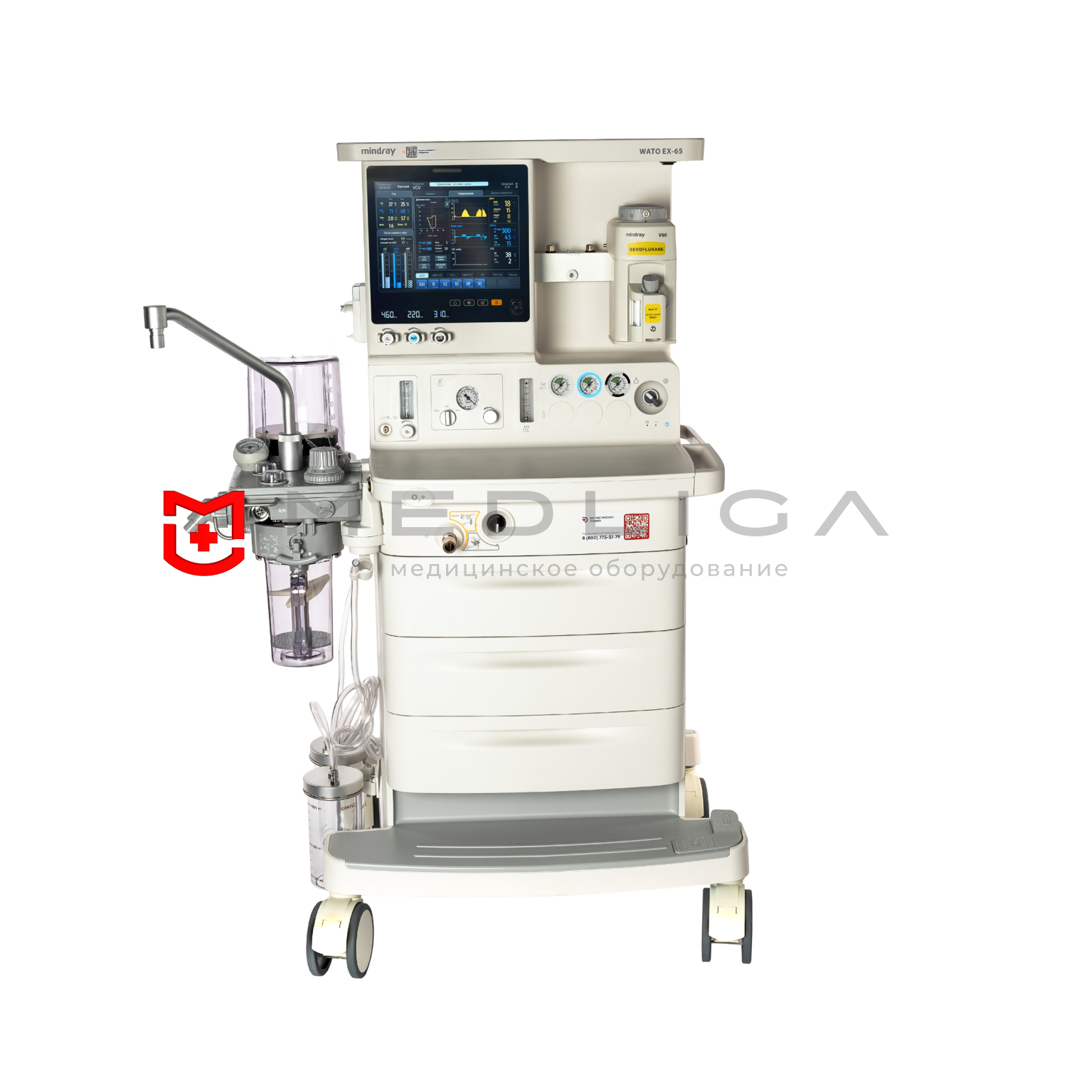 Наркозный аппарат WATO EX-65 с точной подачей газа представляет собой современную и эргономичную систему мониторинга пациента, предполагающую 7 режимов вентиляции, оснащенную большим TFT-экраном сенсорным управлением (12,1 дюйм. по диагонали), электронным газовым расходомером, дыхательным контуром с подогревом.