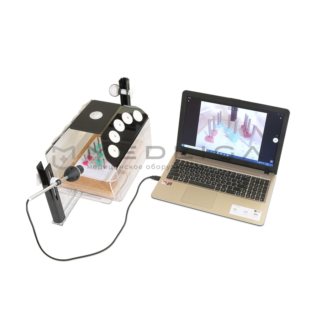 С помощью камеры, подключенной к ноутбуку по USB-интерфейсу, изображение передается на монитор, что позволяет приблизить условия выполнения упражнений к реальным.