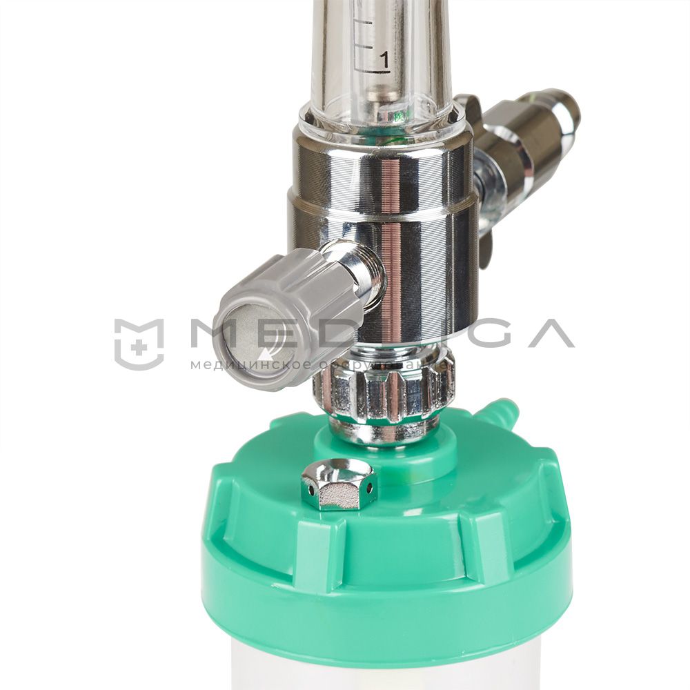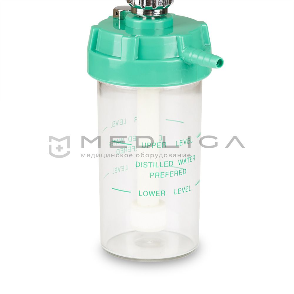 Увлажнитель кислорода оборудован стеклянным ротаметром с металлическим поплавком для определения уровня расхода жидкости. А для контроля потока кислородной смеси имеется механический регулятор.